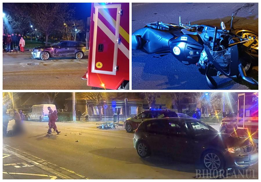 The accident involved a BMW automobile and an Aprilia motorcycle. Police agent-chief Alin Laza of the Bihor Police confirmed the time of the 112 call. Initial reports indicate the motorcyclist, described by witnesses as a young man, sustained injuries and was transported to the hospital for medical attention.