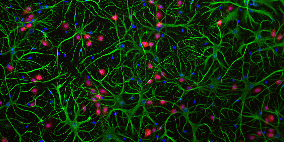 Image shows cells of the brain, including astrocytes (green) and neurons (red). Blue represents cell nuclei.