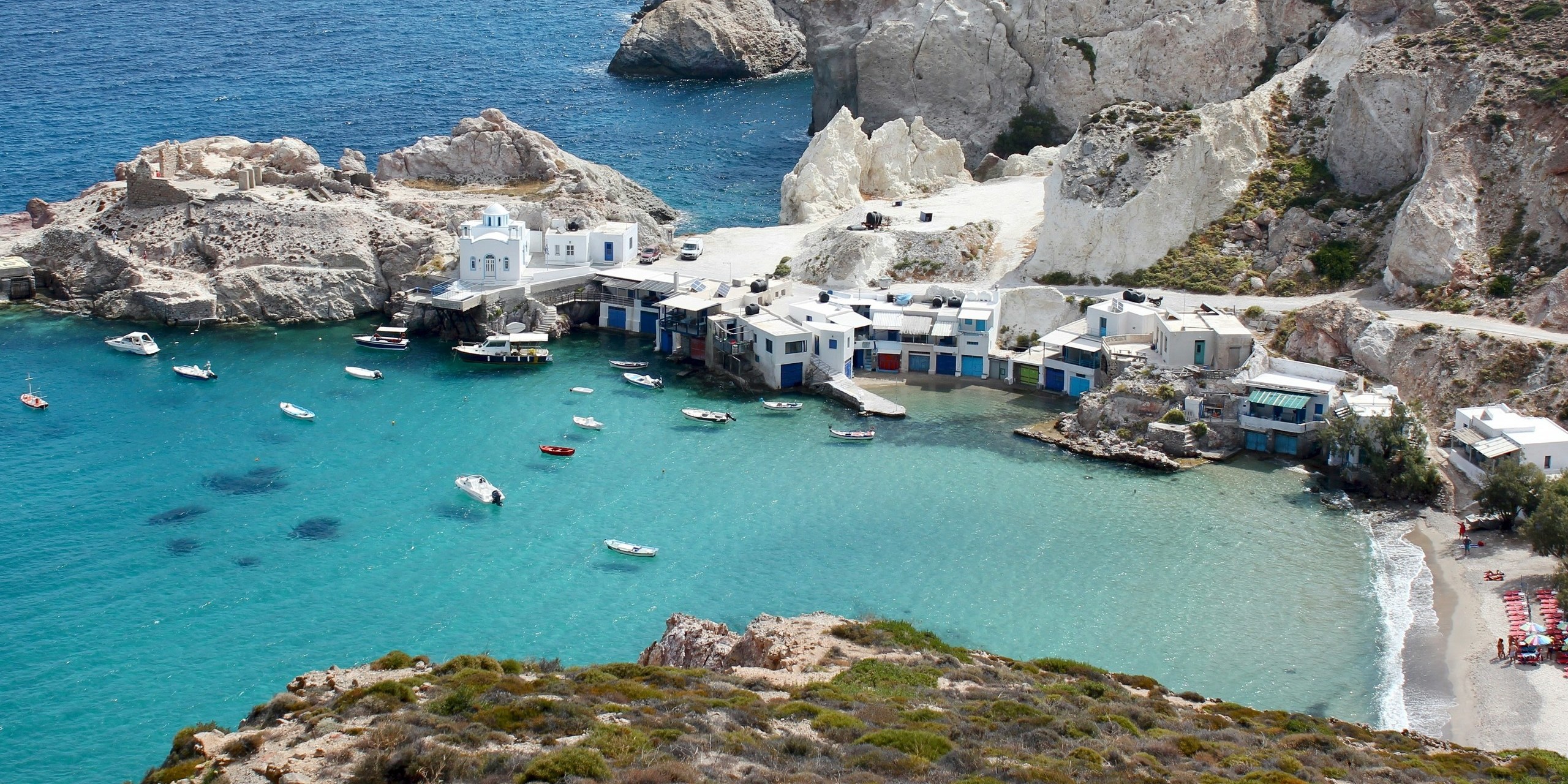 The capital village, Plaka, is situated atop a hill, providing views of the gulf of Milos and the village of Klima. Klima is a traditional fishing village where colorful houses are painted directly onto the rocks above the waterline.