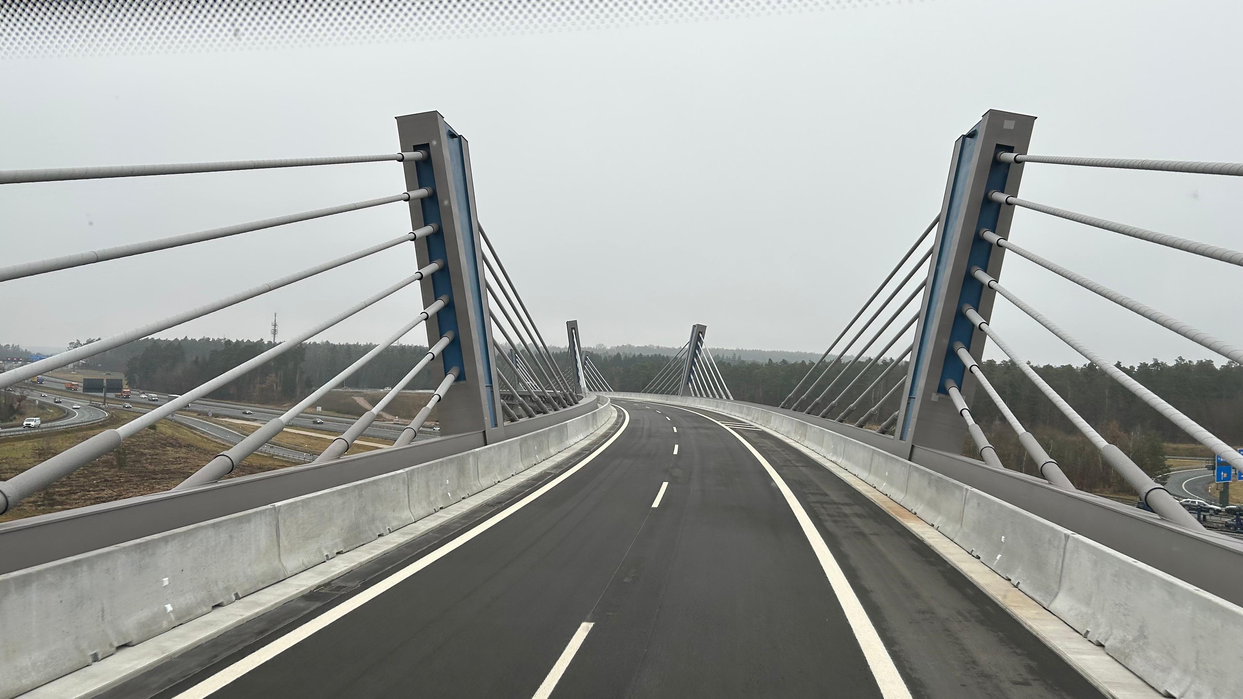 The 15,000‑ton, 600‑metre “Overfly” cable‑stayed bridge spanning the Nürnberg‑Ost interchange has been opened to traffic, ending a delay of roughly one year.